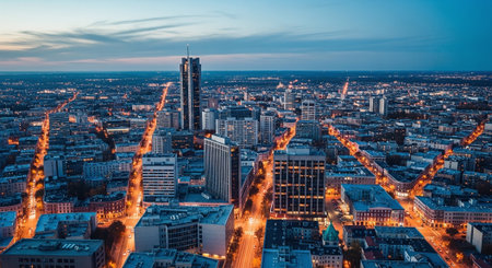 Aerial panoramic view of Frankfurt am Main at night, Germany