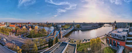 Aerial panorama of Wroclaw city with car bridge over Odra river in Poland, Urban cityscape with historical european architecture