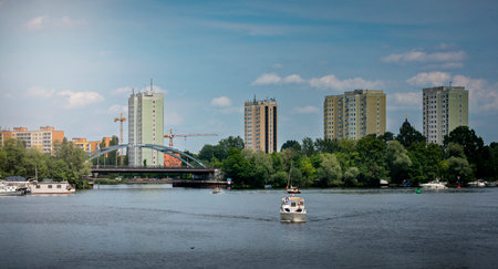 Berlin, Germany - October 29, 2013: View of river Spree from bridge Oberbaumbruecke towards Treptower Park.