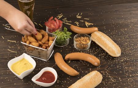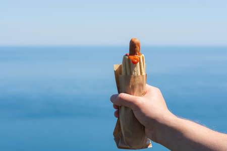 Hot dog in hand against the sky. Fast food. Snack on the street. Summer holiday. The concept of fast food. Junk food.