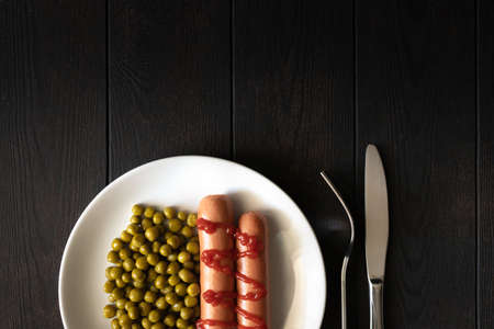 Sausages with ketchup, a side dish of peas on a dark background. Top view. White plate and stainless steel fork. Copy space.