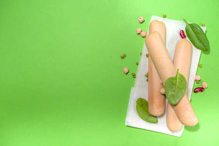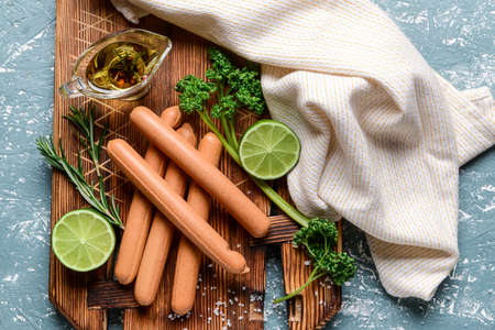 Smoked frankfurter sausages on cutting board on kitchen table. Top view.