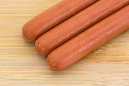 Smoked frankfurter sausages on cutting board on kitchen table.