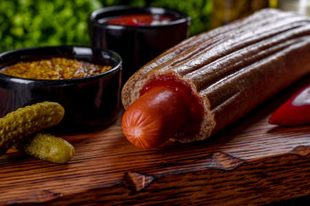 Top view of a hotdog with mustard on a wooden board with pots with ketchup and mustard. Fast food concept.