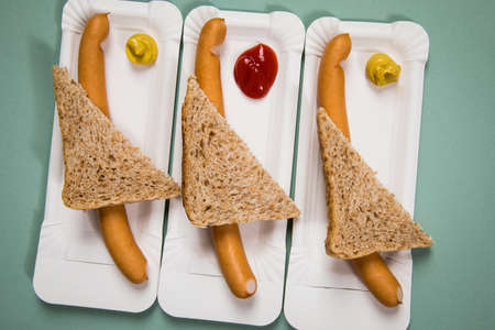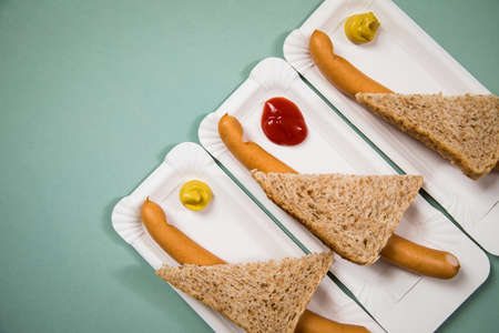 Three Wiener sausages with whole grain bread slice on disposable paper plate with mustard and ketchup on green background
