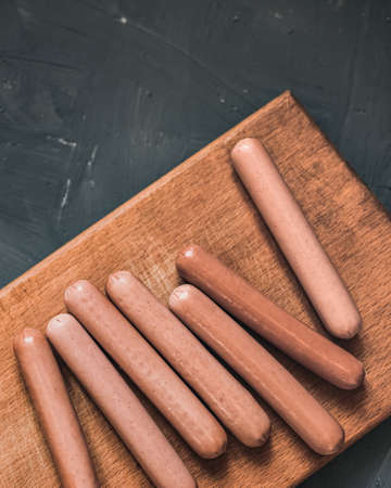Boiled fried sausages sausages lie on a wooden kitchen board scratched against a dark concrete background.