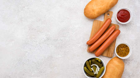 hot dog ingredients with copy space top view