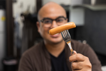 A young Asian man eating breakfast, he eats pork sausage. He poked it with a fork and bit his gut and chewed deliciously. Slow motion and movement short