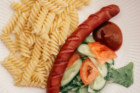 Delicious tasty juicy yellow spiral pasta Fusilli with salad, tomatoes, cucumbers, green, ketchup sauce, grilled hunter sausage with knife cuts on white dish plate. Studio lights, close-up. Top view