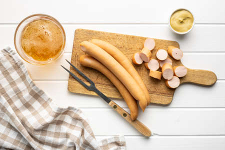 Sliced smoked frankfurter sausages on cutting board on white table. Top view.