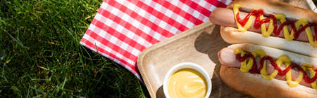 top view of hot dogs and mustard in bowl near plaid table napkin on green grass, banner
