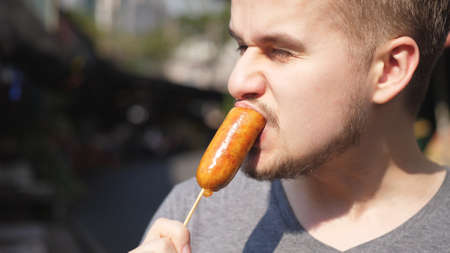 Man eating grilled sausage pork sausage with mustard and wheat
