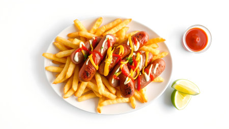 Close-up of corn dogs over skewers with mustard sauce on white background with copy space. unaltered, unhealthy food, copy space, meat, sausage and fried food.