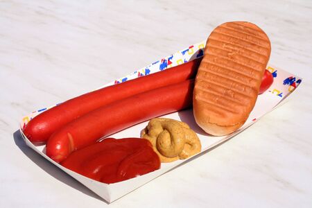 Debreziner, sausage; rolls; mustard; Polish sausage, barbecue
