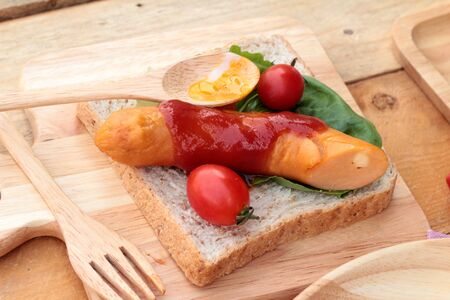 Fried tasty sausage in a bun with mustard and ketchup with coffee in a cafe