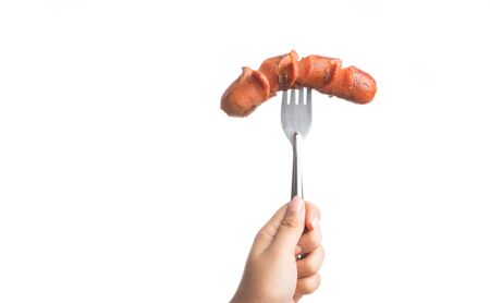 Grilled Sausage on fork isolated on over white background