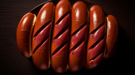 hot dogs in a white skillet in a dark wooden shack, reminiscent of classic still life compositions. the image features a combination of dark pink and dark gold hues, with smooth lines and a touch of dark red. the layered translucency adds depth, while the brown tones and close-up intensity create a captivating visual. ai generated