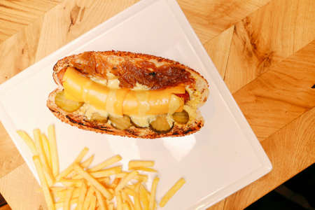 The hot dog lies on the fries. Yellow bright background. Food background. View from above.