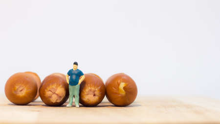 Miniature people : Close up fat man standing and looking at sausages isolated on white background (Food concept)