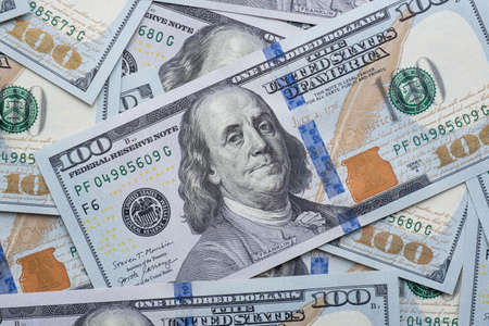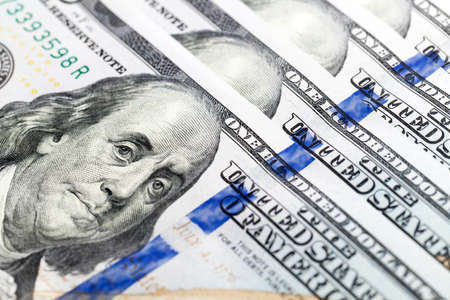 Closeup view of one hundred dollars banknotes as financial background. Cash money. Financial growth and business concept. Money background
