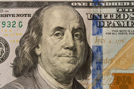 Closeup portrait of Benjamin Franklin on 100 us dollar bill