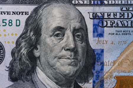 Benjamin Franklin's portrait on one hundred (100) american dollar bill. Macro close up view.
