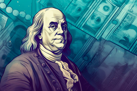 Close-up of Benjamin Franklin on the $100 bill, dramatically lit and hand-colored.