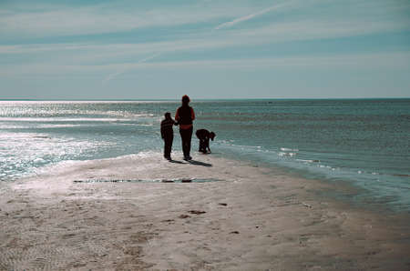 Silhouette of happy children and mother playing on the beach. Concept of friendly family.