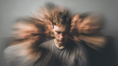 A young man sits quietly while motion blur creates a sense of chaos around his still face, contrasting peace with movement in an indoor space.