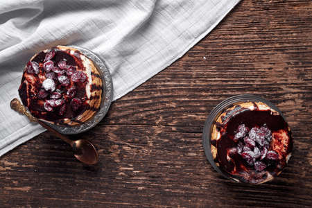 Ice cream with strawberry jam. Two bowls of yogurt on a wooden table. Creamy ice cream with berry syrup.