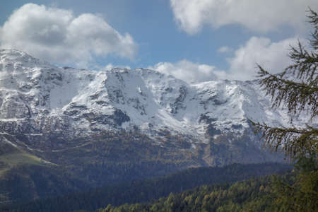 Alpin mountain in the alps salzburg filzmoos gosau tirol austria switzerland blue sky and green nature rocky mountains with stones and clouds and natural height seeing pieces of snow beautiful nature wallpaper . High quality photo