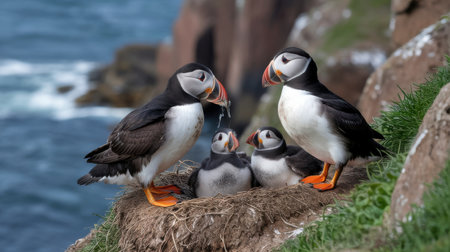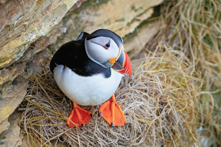 A puffin stands proudly on a nest made of dried grass along a rocky cliffside. Its vibrant beak and striking plumage contrast beautifully with the natural surroundings in springtime. AI Generated