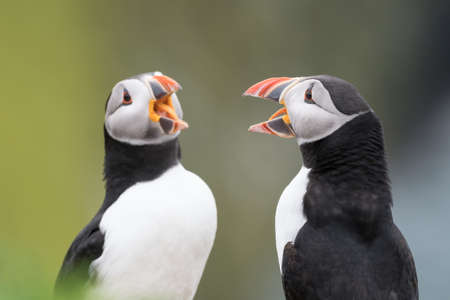 Mirroring behaviour of two puffins (Fratercula arctica). Beaks open, showing tongues. Appearance of reflection in mirror.