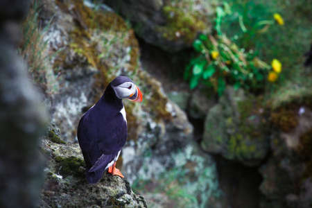 Portrait of Atlantic puffin in natural habitat, Fratercula arctica. One bird sitting on cliff with blooming chamomiles in Latrabjarg, Iceland.
