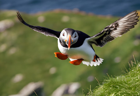 Atlantic Puffin or Common Puffin, Fratercula arctica, in flight on Mykines, Faroe Islands