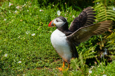 Cute Atlantic Puffin spreading wings, Shetland Islands, UK