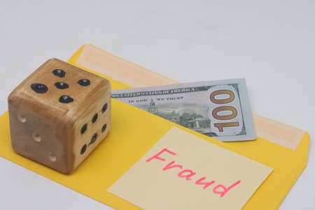 banknotes in a yellow envelope. Fraud concept. financial fraud. Dice. Sticker labeled scam, fraud