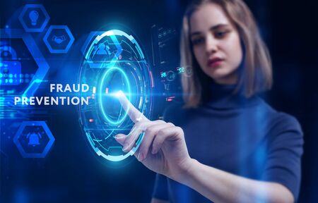 Business, Technology, Internet and network concept. Young businessman working on a virtual screen of the future and sees the inscription: Fraud prevention