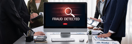 Board showing digital fraud detection interface with security icons and blue circuit board background...