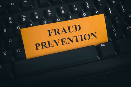 Yellow paper note on black keyboard with writing Fraud Prevention. Close up.