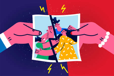 Great concept of divorce, betrayal, separation, woman hand ripping photo of the couple.