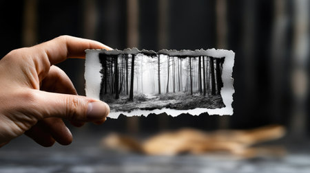 A captivating image of a hand holding a torn photograph depicting misty pine trees in a dark, atmospheric setting. Evokes emotions and memories.