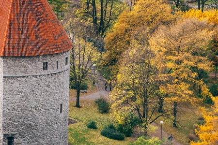 Medieval tower and colorful autumnal park. Fall season scene