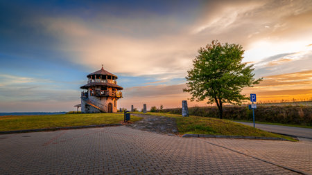 A stone observation tower and a lonely tree against the background of a colorful sky at sunset. Beautiful colors of the golden hour. Susiec, Roztocze, Poland
