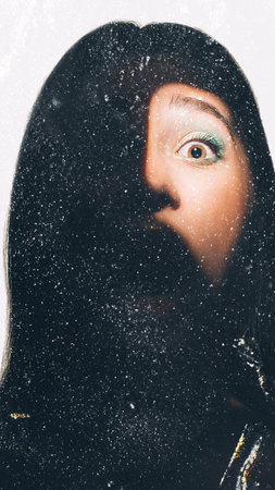 Mysterious portrait. Scream woman. Surreal universe. Glitter in scared frustrated lady black sparkling silhouette double exposure.