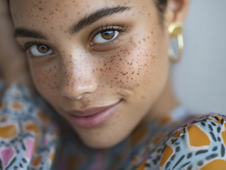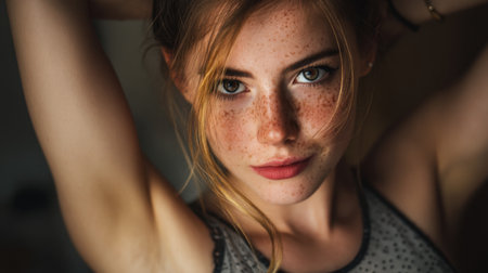 A stunning close-up portrait of a young woman showcasing her freckles and captivating eyes. The image captures a moment of serenity and natural beauty.