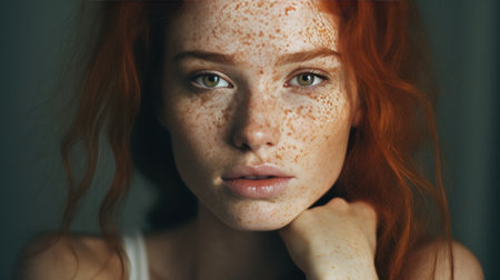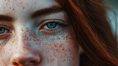 Close up portrait of young woman with freckles, showcasing her striking green eyes and natural beauty. soft lighting highlights her features, creating intimate and captivating atmosphere