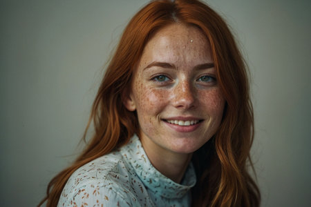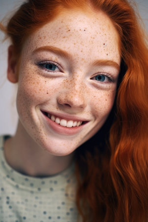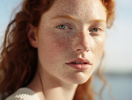 Captivating close-up portrait of a redhead girl with freckles, showcasing her unique beauty.