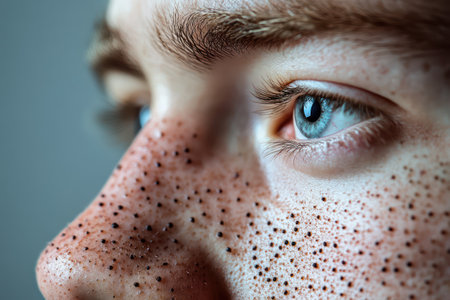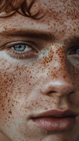 A photo portrait in candid realism portrays a guy with distinctive freckles on his face, highlighting his natural beauty and character in a sincere