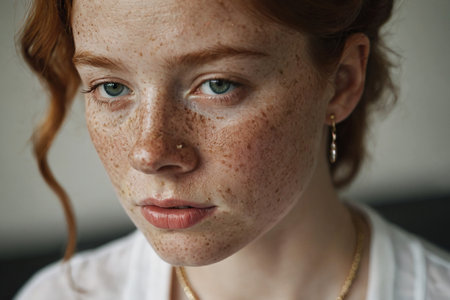 In the style of natural portrait photography, a close-up reveals a girl with multiple freckles on her face, emphasizing her natural beauty and individuality